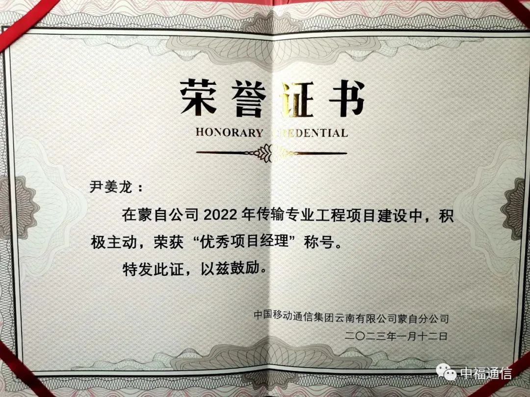 紅河項目部尹姜龍在2023年1月獲得中國移動通信集團云南有限公司蒙自分公司“優(yōu)秀項目經(jīng)理”稱號。