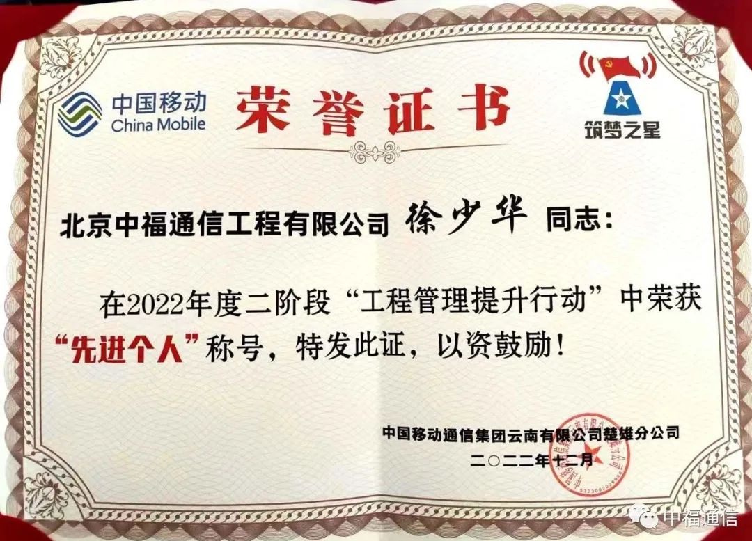 與此同時,中國移動通信集團云南有限公司楚雄分公司在2022年度第二階段“工程管理提升行動”中授予徐少華同志“先進個人”稱號。